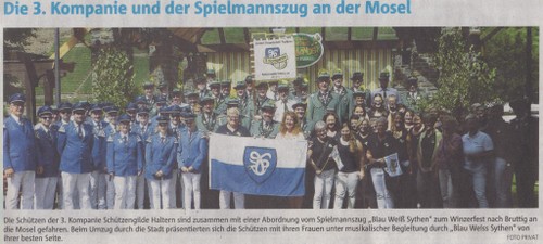Die 3. Kompanie fuhr am 14. August 2016 zum Winzerfest in Bruttig-Fankel. In diesem Jahr begleitete uns der Spielmannszug Blau Weiss Sythen. Bei schönem Wetter genossen viele Mitglieder, Freunde und Bekannte der 3. Kompanie den Tag an der Mosel. Um 14:30 Uhr startete der Festumzug durch den Weinort Bruttig, an dem die 3. Kompanie teilnahm.