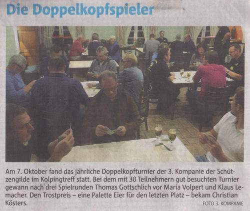 In unserem Kompanielokal dem "Kolpingtreff" wurde am 07.10.2016 unser jährliches Doppelkopfturnier durchgeführt. Einige Spieler unserer Kompanie mit Freunden und Bekannten trafen sich zu diesem Anlass um einen Vergnüglichen Abend zu verbringen. Es wurde an 4er und 5er Tischen gespielt. 3 Durchgänge mit je 2 Runden wurden gespielt zu denen die einzelnen Spieler und Spielerinnen per Auslosung den Tischen zugewiesen wurden. Den ersten Platz belegte dieses Jahr Thomas Gottschlich vor Maria Volpert und Klaus Lehmacher. Die diesjährige rote Laterene hatte Christian Kösters. Zur Siegerehrung durften sich die Spieler ihre Preise einzeln unter dem Applaus der Mitspieler abholen.