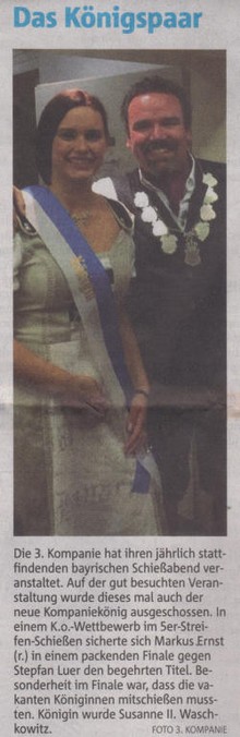 Einen schönen Abend verlebten viele Mitglieder, Freunde und Bekannte der 3. Kompanie am 14. Oktober 2016 bei unserem diesjährigen Bayrischen Schiessabend. In diesem Jahr wurde an diesem Abend unser Kompaniekönig ausgeschossen. Nach einem spannenden Finale wurde unser Kompaniekönigspaar Markus I. Ernst und Susanne II. Waschkowitz. Eine schöne Dekoration, zümpftiger bayrischer Musik und Leckerbissen nach Bayrischer Art rundeten den Abend ab.