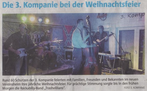 Am 09.12.2016 wurde zum Jahresausklang erneut von der 3.Kompanie die etwas andere Weihnachtsfeier organisiert. Zum erstenmal auf unserem neuen Schiessstand. Mitgliedern der 3. Kompanie in Begleitung von Partnern und Freunden feierten einen fröhlichen Abend. Zur Unterhaltung spielten die Trashvillians auf. Es wurde bis mitten in die Nacht gefeiert.
