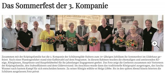 Anlässlich des 70-jährigen Bestehens der 3. Kompanie verbrachten viele Mitglieder, Freunde und Bekannte der 3. Kompanie zusammen mit der Kolpingsfamilie am 29. Juni 2024 einen schönen Nachmittag bei unserem diesjährigen Sommerfest. Wir starteten mit einer Planwagenfahrt und bei der anschließenden Kaffeetafel im Gildehaus wurden Bilder aus vergangenen Zeiten auf die Leinwand projiziert. Für die Kinder gab es eine Hüpfburg und ein weiterer Höhepunkt war das Vogelwerfen um die Kompaniekönigswürde. Kompaniekönig wurde Sascha I. Wanner und seine Königin Helga I. Loebe. Für das leibliche Wohl wurde an der Grillstation gesorgt.