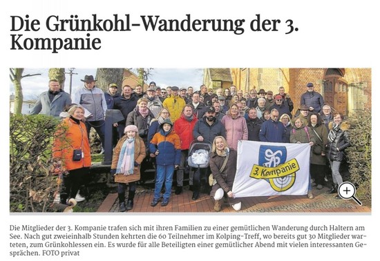 Zu einem gemütlichen Spaziergang trafen sich die Mitglieder der 3. Kompanie mit Familie, Freunden und Bekannten am Samstag dem 24.02.2018 an der Erlöserkirche mit rd. 60 Teilnehmern. Nach gut zweieinhalb Stunden sind die Teilnehmer im "Kolping-Treff" zum Grünkohlessen eingekehrt. Der "Kolping-Treff" war bei dieser Veranstaltung, mit 30 zusätzlichen Anmeldungen, gut besucht.